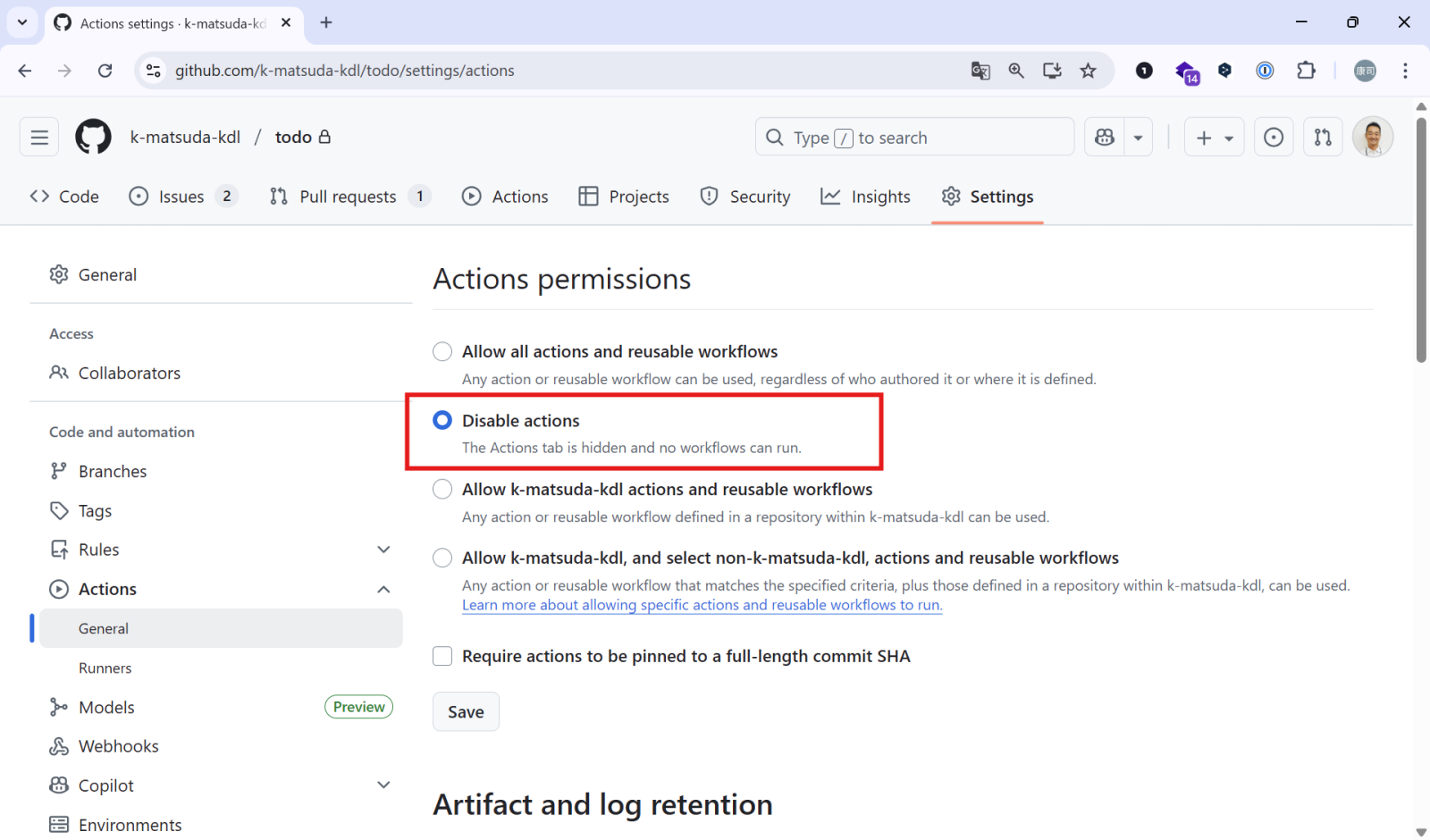 このリポジトリでは、GitHub Actionsを使わないという場合は、無効化しておきましょう。リポジトリのSettings -> Actions -> General から変更可能です。
