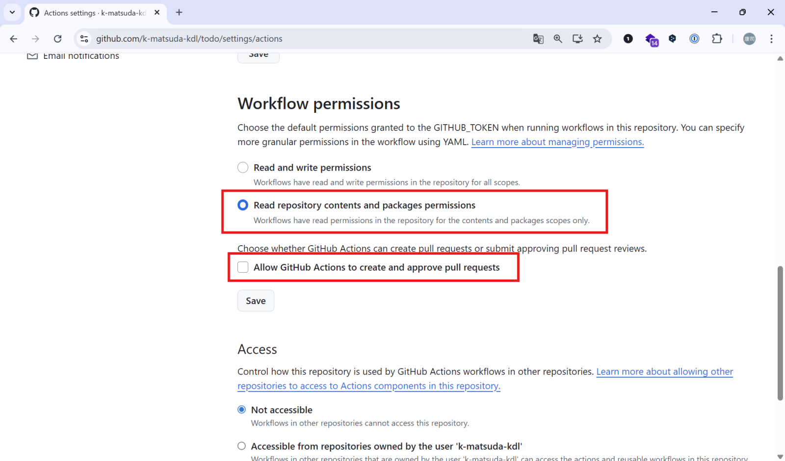 下図のようにリポジトリとパッケージの読み取り権限のみとし、さらにActionsからのプルリクエストとその承認を許可しないようにすると、ActionsからWorkflowを勝手に作成されることを抑制できます。