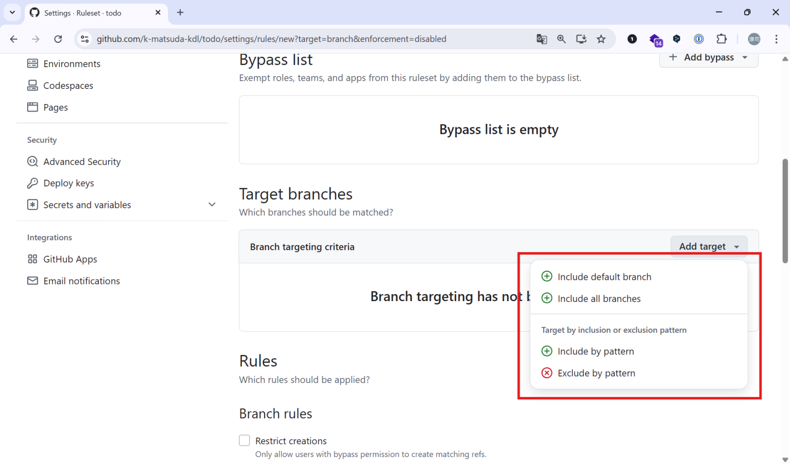 同じくSettings -> Rules -> Rulesets からNew branch rulesetを作成します。Target branchesを指定します。