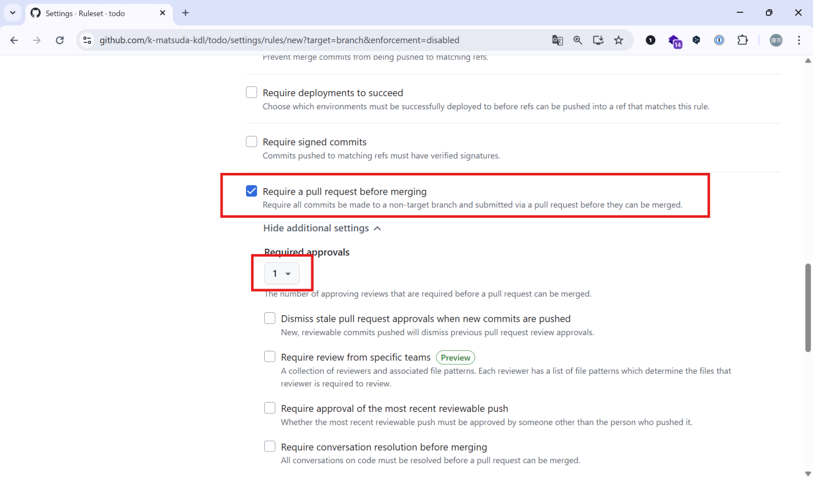 main およびデフォルトブランチに対して、「プルリクエストしないとマージできない」という保護をつけておきましょう。