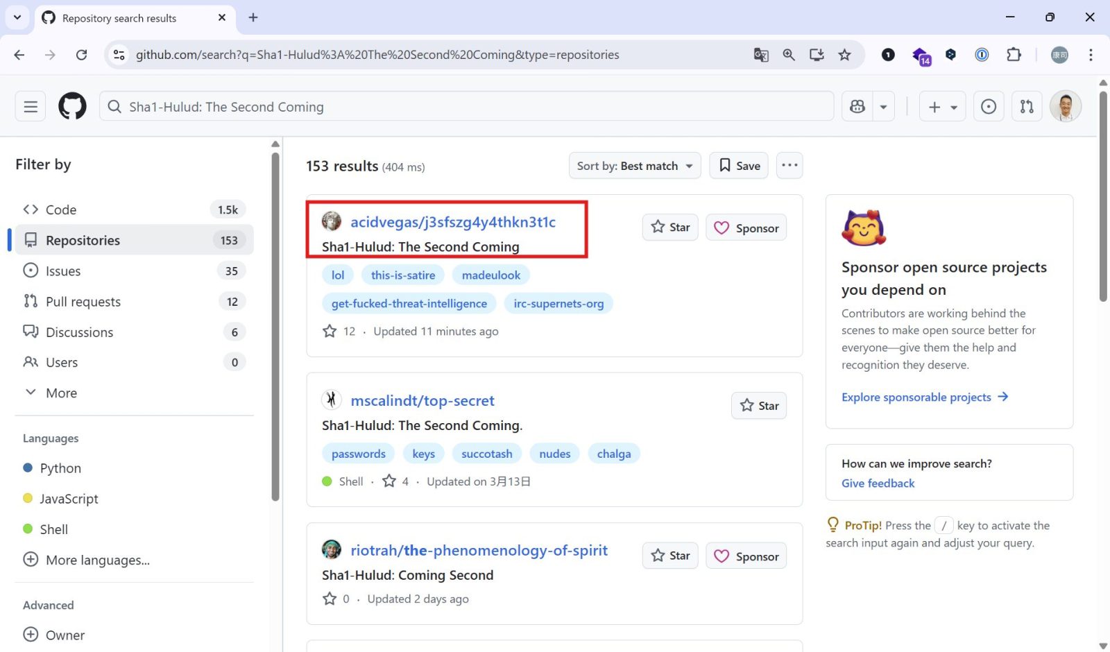 わかりやすく「Sha1-Hulud: The Second Coming」というdescriptionが残ります。