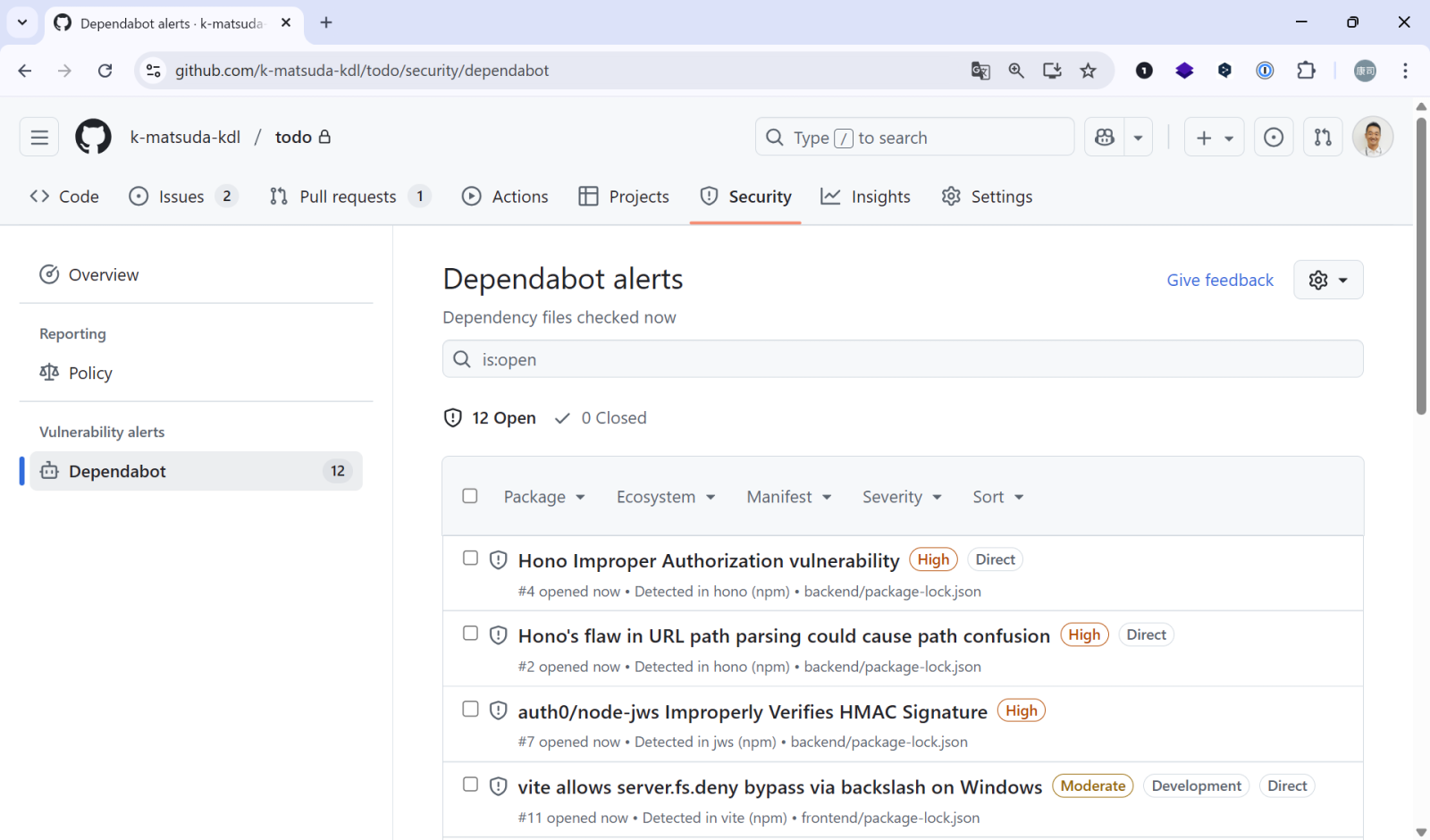 さらに、GitHub限定ですが、Dependabot というパッケージの脆弱性をアラートする機能があります。(アラートのみを使います)